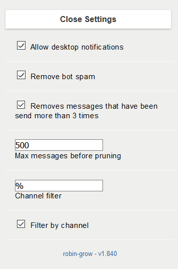 Chats tend to become very spammy as they grow, attracting not just twitch spam, but also a lot of botspam. Using robin-grow makes the chat more normal, or at least more manageable.