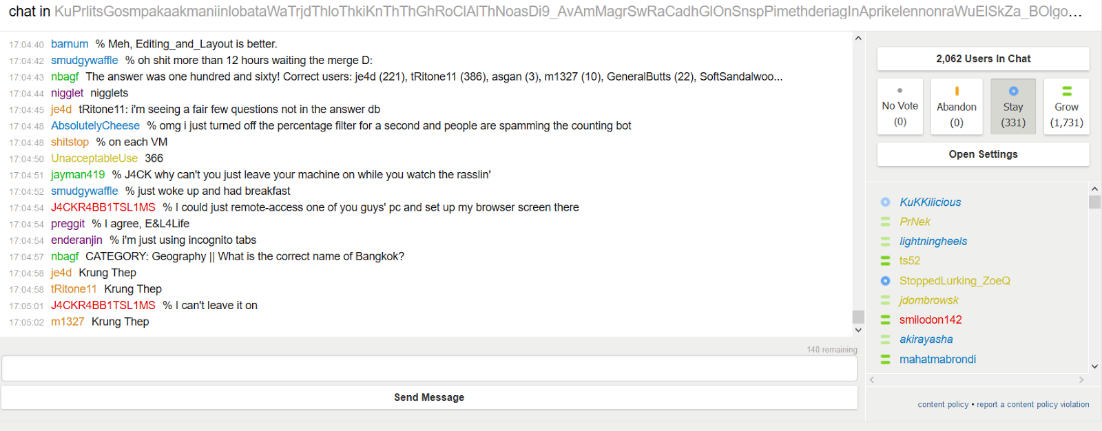 The other thought is that eventually people will just leave, or there will be diminishing returns as time goes on and people stop voting or close the chat.